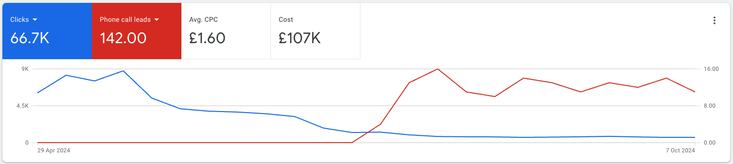 When we took on the account, despite spending £20k+ per month there were no conversion actions set up. We worked closely with the development team to provide direction for what CRO amends we needed implementing on the site. Alongside this we configured GTM, GA4 and Google Ads tracking, whilst setting up dynamic phone call tracking and lead form tracking.